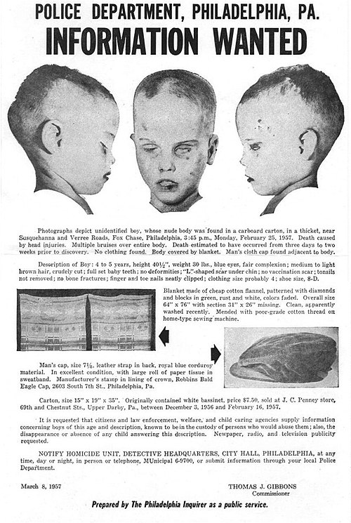 Τον Φεβρουάριο του 1957, ένας φοιτητής που έλεγχε παγίδες για ποντικούς, σε μια δασώδη περιοχή, σκόνταψε πάνω σε ένα κουτί από καλαθούνα μωρού του καταστήματος JCPenney. Μέσα, ανακάλυψε το σώμα ενός αγοριού, ηλικίας περίπου 4 έως 6 ετών.